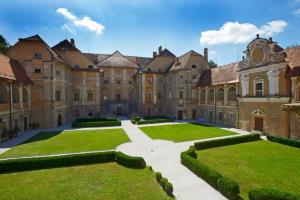 Razkošen baročni dvorec je najverjetneje že leta 1696 dal postaviti grof Ignacij Maria Attems za svojo poletno rezidenco, končali pa so ga med leti 1720 in 1740. Attemsi so bili predvsem v času baroka ena najvplivnejših plemiških rodbin na Štajerskem. Rodbina izvira iz Furlanije, njihov rod pa se je začel razvijati v drugi polovici 12. Stoletja, na gradu Attimis pri Čedadu, slikovitem mestu v severni Italiji, ob reki Nadiži. Opravljali so pomembne službe na habsburškem dvoru in bili leta 1630 povzdignjeni v državne grofe Svetega rimskega cesarstva. Posebej za Attemse je dvorec načrtoval italijanski arhitekt Giovanni Battista Camessini, ki je bil eden dejavnejših arhitektov tistega obdobja. Dvorec je simetrično zasnovan. Znotraj je bil urejen manjši baročni vrt. Vhodni, nižji trakt ima z dvoriščne strani široko, z bogatim štukom okrašeno prehodno vežo. Prostori se čez dvorišče in dvoramno stopnišče stopnjujejo v poslikano reprezentančno dvonadstropno dvorano centralnega trakta dvorca. Dvorec je najbolj znan po freskah in štukaturah v viteški dvorani in elegantnih salonih, ki se nahajajo levo in desno od nje. Alegorije na stropu dvorane, obrobljene s štukaturami, ponazarjajo antično mitologijo: Znanost in Umetnost pod okriljem Miru ter štiri elemente: zrak, zemljo, vodo in ogenj, ki so nasploh znani kot nek zaščitni znak Attemsov. Skupno je upodobljenih 25 prizorov, ki jih po manj zanesljivih podatkih lahko pripišemo kot delo slikarja Joanneckyja. Ime mojstra, ki je naredil štukature, ni znano. V stranskih prostorih je nekaj kvalitetnih peči in delov prezentirane opreme. V zahodnem stavbnem traktu je baročna kapela, oltar zanjo pa je izdelal Martin Baselij. Okoli dvorca je bil urejen vrt v baročnem slogu, kasneje pa so površine preuredili v angleškem krajinskem slogu, zasnova pa je delno ohranjena še danes. Severna dostopna pot je obsajena s kostanjevim drevoredom. Širše območje parka je zasajeno z domačimi in tujerodnimi drevesi, med katerimi izstopa orjaška duglazija (iglavec uvožen iz Severne Amerike). Med njimi so speljane vijugaste poti, območje parka pa prehaja na zahodu v gozd, kjer je več ribnikov.